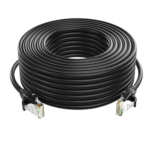 Cable de red CAT5e UTP patch cord de 20 metros para uso exterior, diseñado para soportar condiciones ambientales como sol, humedad y polvo. Ideal para instalaciones en exteriores, cámaras de seguridad y conexiones de larga distancia con mayor durabilidad y resistencia.
