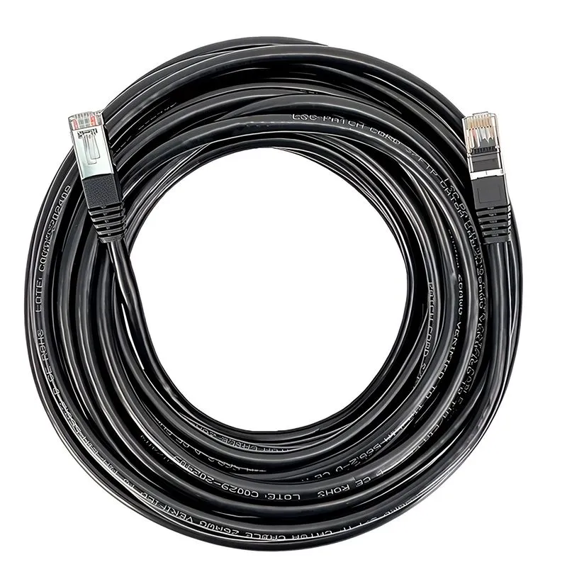 Cable de red CAT6 UTP patch cord de 20 metros para uso exterior, diseñado para soportar condiciones ambientales como sol, humedad y polvo. Ofrece mayor velocidad y estabilidad que CAT5e, ideal para cámaras de seguridad, instalaciones externas y redes de alto rendimiento.