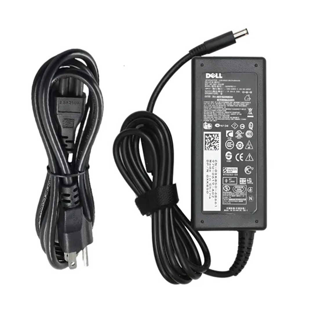 Cargador original para laptops Dell, 19.5V, 3.34A, punta negra fina, compatible con múltiples modelos. Ideal para reemplazo o uso de repuesto.