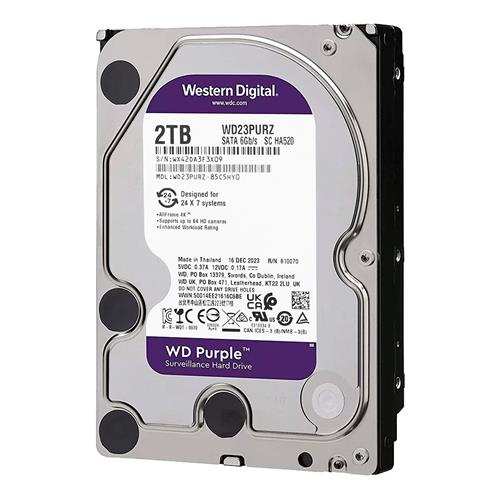 Disco duro HDD Western Digital Purple de 2TB en formato 3.5 pulgadas con interfaz SATA 6Gb/s, diseñado especialmente para sistemas de videovigilancia como DVR y cámaras de seguridad. Optimizado para funcionamiento continuo 24/7, ofrece alta capacidad de almacenamiento, estabilidad y durabilidad para grabación constante de video.